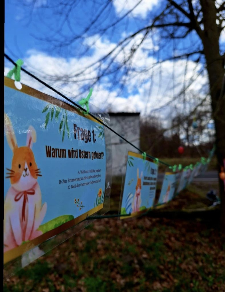 Während der Osterferien konnten Besucherinnen und Besucher in Teupitz einen besonderen Osterweg erkunden. Die kleine Entdeckungstour startete am geschmückten Osterbaum auf dem Marktplatz und führte rund 1,5 km durch die Stadt bis zur Heilig-Geist-Kirche. Entlang des Weges luden dabei verschiedene Stationen zum Rätseln, Gestalten, Zuhören und Beobachten ein.